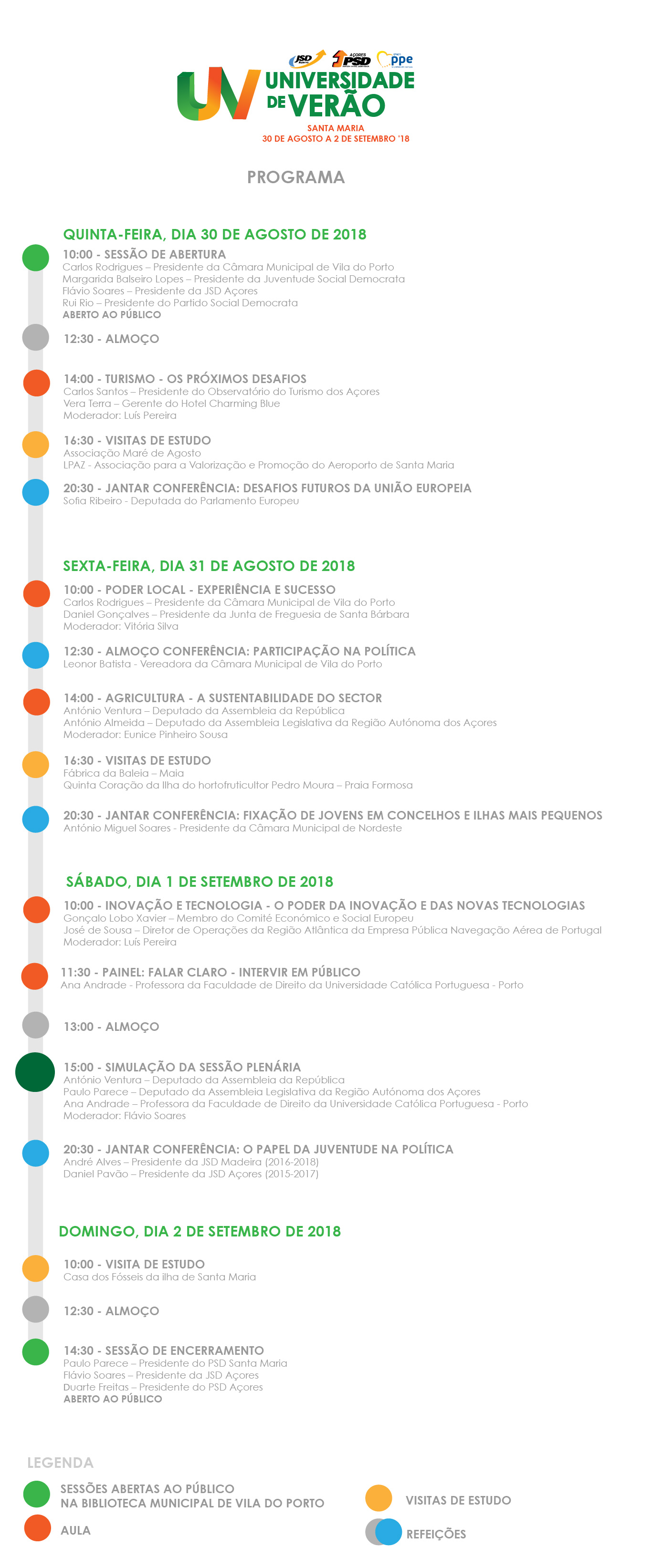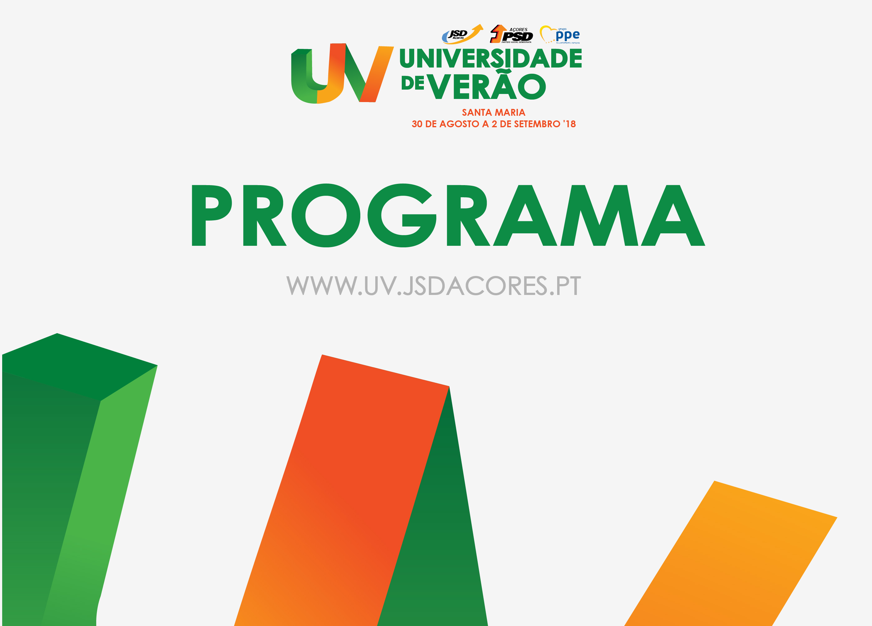 A UV Açores 2018 começa a 30 de Agosto, com a presença de Rui Rio, Presidente do PSD, e de Margarida Balseiro Lopes, Presidente da JSD, terminando apenas a 2 de Setembro, com a sessão de encerramento, onde participam os presidentes das estruturas regionais organizadoras de mais uma UV, Duarte Freitas e Flávio Soares.